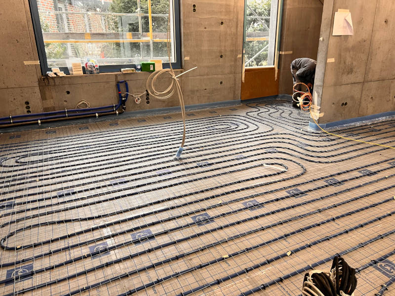 Da es sich bei diesem modernen Wohntraum um einen Neubau handelt, musste kein bestehender Fußbodenbelag entfernt werden. Wir konnten direkt mit Tragschicht aus Unterbeton beginnen, in der sich ebenfalls die Fußbodenheizung befindet. Die Fußbodenheizung wurde von uns auf einer Trittschall- und Sperrschicht vor der Erstellung der Tragschicht sorgfältig verlegt.